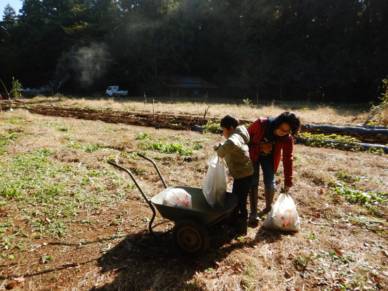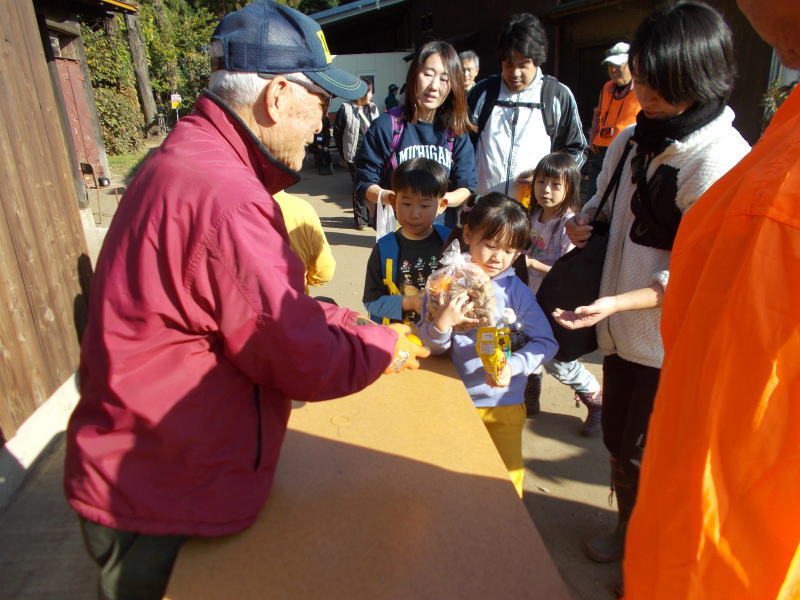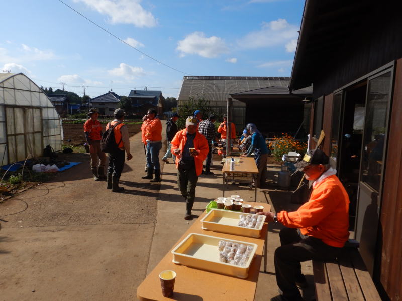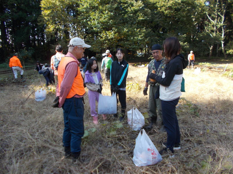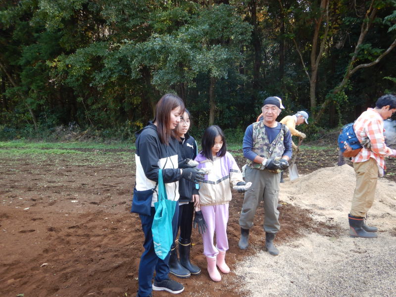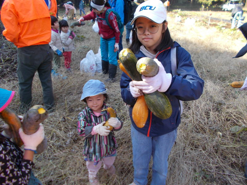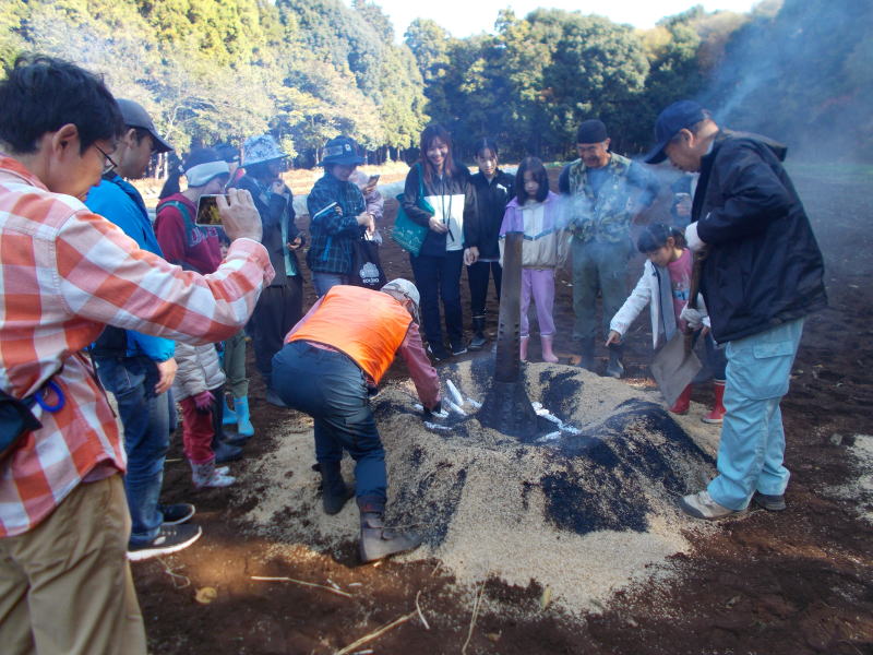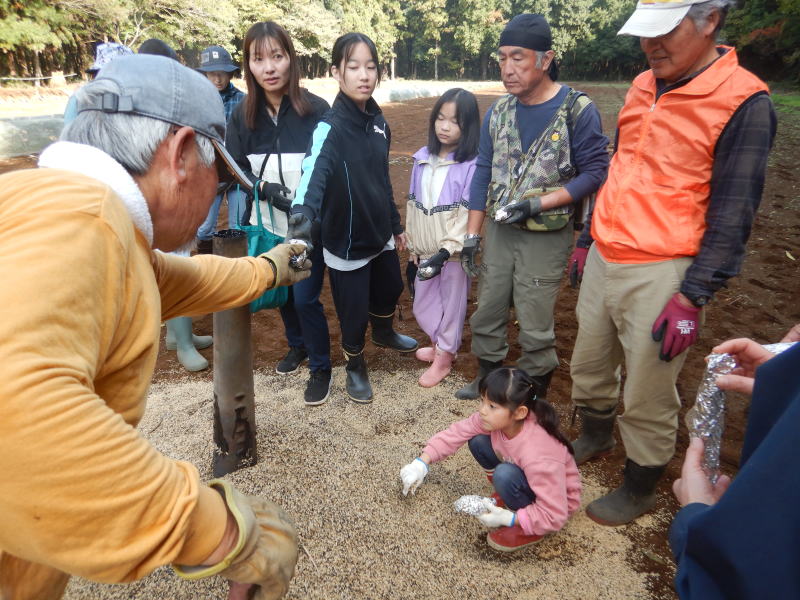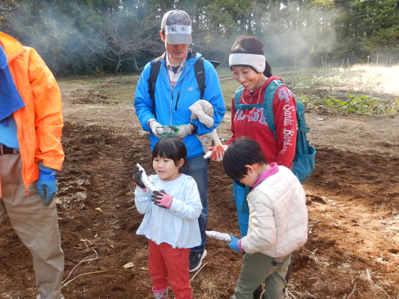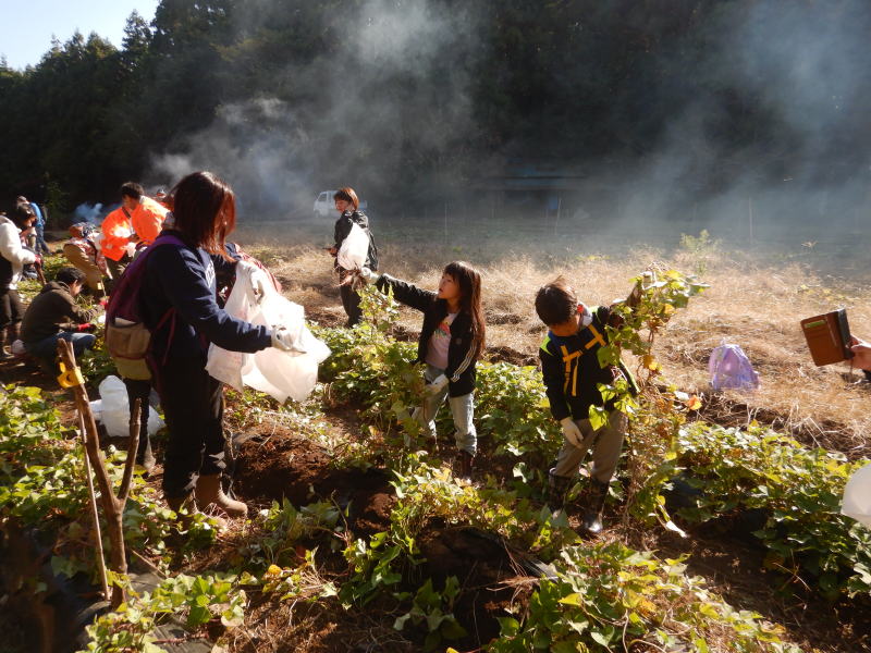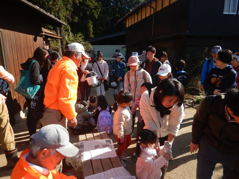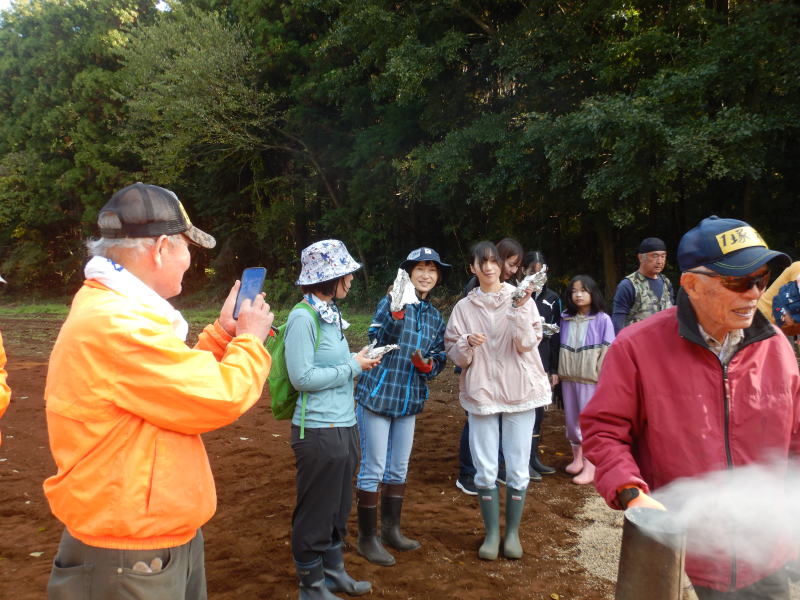 | 11月15日(土)つくばフォレストクラブと六斗の里山をを守る会との共催で、『2025六斗の里山「おぐろくの森」収穫祭』を開催しました。参加者は、児童養護施設の『香風寮』から10人の子供たちも来る予定でしたが、あいにくインフルエンザの流行で来れなくなったものの、それでも親子を中心に、スタッフやおにぎり作りで参加した六斗地区の主婦を含め総勢76人が集まりました。 収穫祭は午前9時30分からはじまり、全員集合の記念写真を撮った後、さつまいもを濡らした新聞紙とアルミ箔に包んでおぐろくの森の畑に集まり、10時からもみ殻燻炭による焼いもづくり。そしてカボチャ(鶴首かぼちゃ)採り、サツマイモ掘りでは大きな袋に一杯詰めて込んでいいました。 そのあとは、たわわに実った大きな柿(渋柿)の木を切り倒して柿拾いを楽しんだ。昼には六斗の主婦の方々による、六斗集落に古くから継承されてきた「伝統のおにぎり」が作られ、そして、おぐろくの森で穫れたカボチャのポタージュが出された。握られた160個のおにぎり、大釜いっ杯のポタージュは子供たちから「美味しい、美味しい」と「おかわり」が相次いで出され・・・、気が付いたら空っぽになっていました。 昼食を終え午後からは、畑に移動して焼きいもの掘り出し。出来立ての焼いもを手にして子供たちからは大歓声が上がっていました。そしてそのあとは、全員でおぐろくの森の中に入り、腐葉土づくりのための落ち葉集めを行いました。 集めた落ち葉は、丸太で囲んだ「落ち葉ステーション」に投入され、子供たちはふかふかな落ち葉の上に乗って楽しんだ。 午後2時過ぎには、無事すべてのイベントも終わり、帰り際には沢山穫れた柿、落花生、カボチャ、さつまいもを抱えて、嬉しそうに帰っていく親子の後ろ姿が印象的でした。翌日には「大変楽しかった。子供たちも大変喜んでいました。」「子供たちにいい体験ができました。来年もぜひ参加したい。」との声が寄せられました。 |