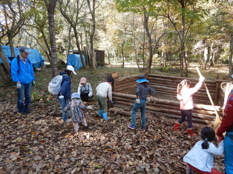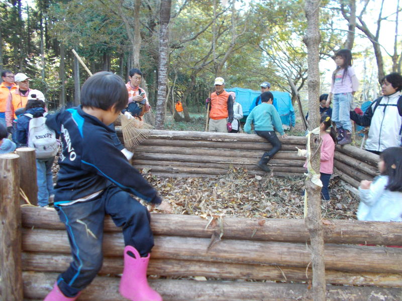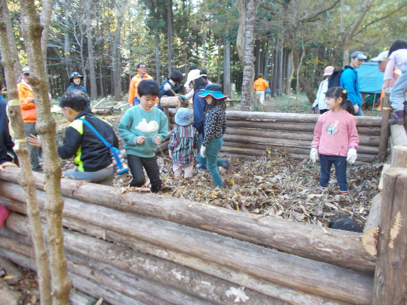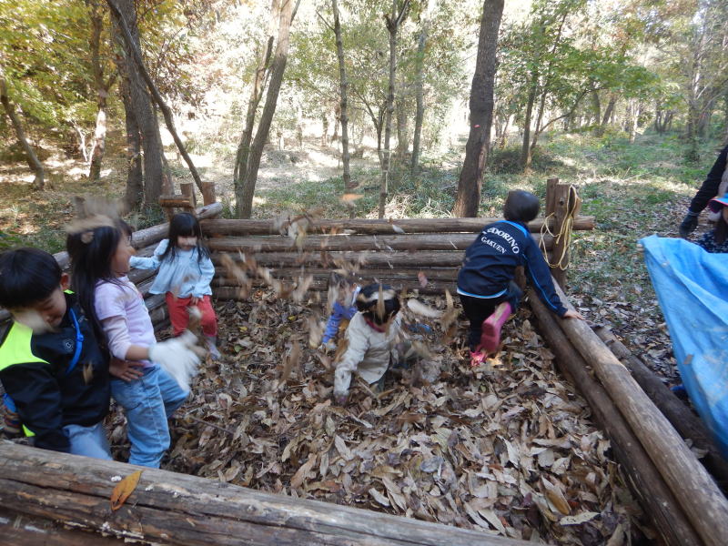| 子供たちは落ち葉のプールで楽しんでます |