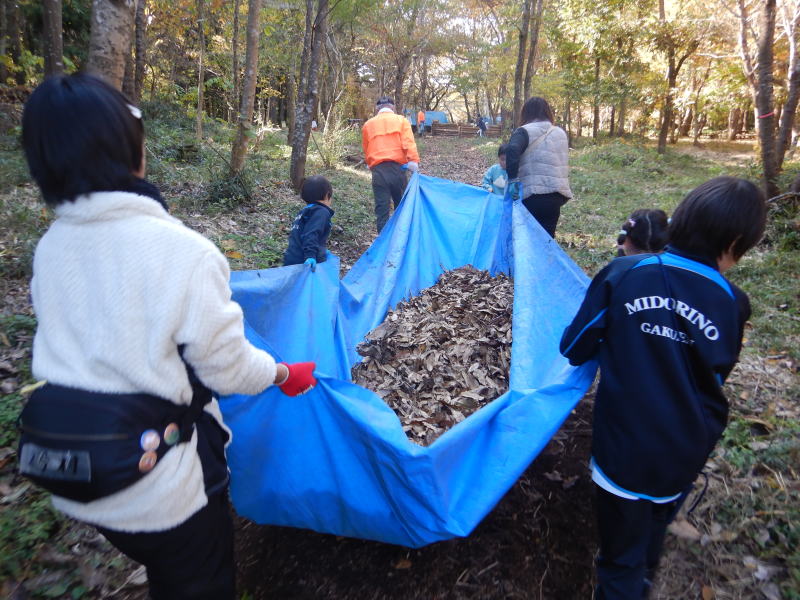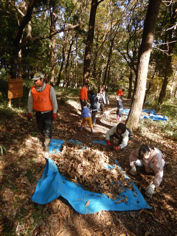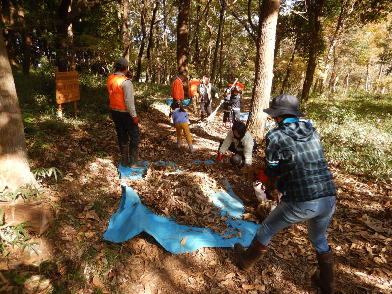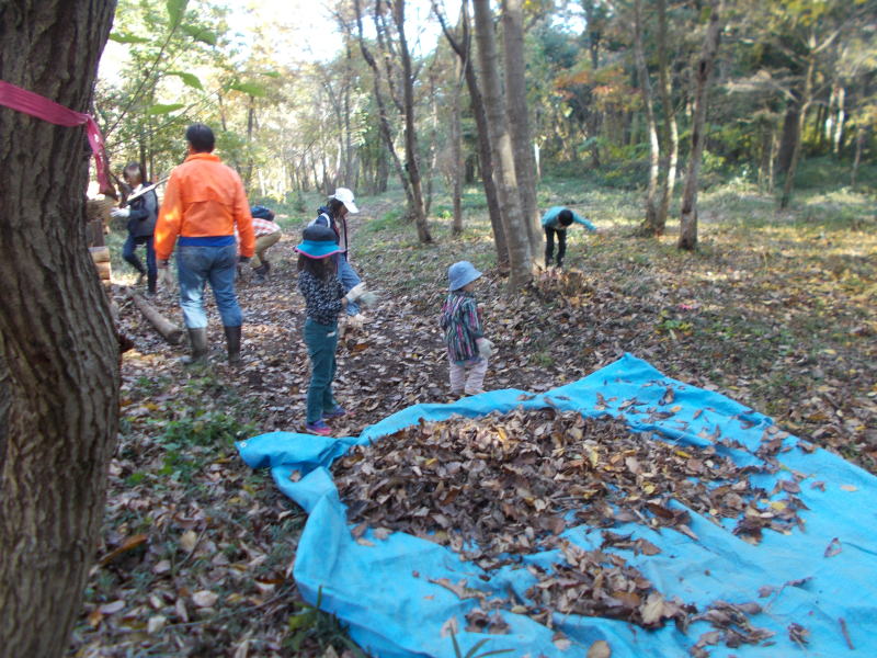 | 落ち葉をブルーシートに集めています |